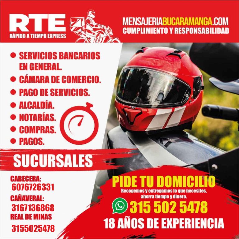 RTE – Rápido a Tiempo Express – Mensajería Bucaramanga – Cumplimiento y responsabilidad: Servicios Bancarios en General, Cámara de Comercio, Pago de servicios, Alcaldía, Notarías, Compras, Pagos. Sucursales: Cabecera 6076726331 – 3165266662 Cañaveral 6076726331 – 3165266662 Real de Minas 6076726331 Pide tu domicilio. Recogemos y entregamos lo que necesites, ahorra tiempo y dinero. Teléfono principal: 3155025478 – 23 años de experiencia.